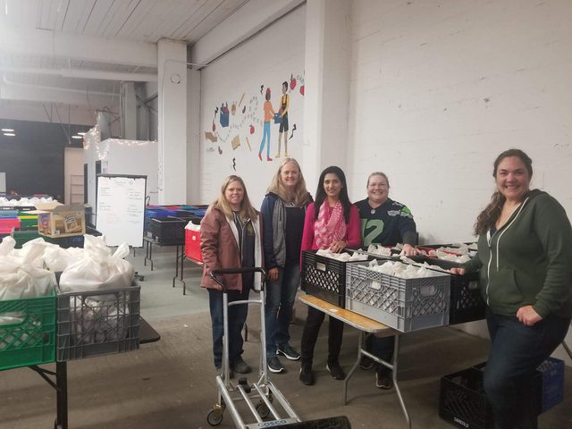 The Sales Operations Team, including Alisa Garcia, Kelly Erickson, Jen Van Dijk, Sapna Kumar, and Kelly Gibbons, volunteers with Backpack Brigade to sort and fill individual bags of food that are distributed to 78 elementary and secondary schools in King County for students in need with food scarcity on the weekends. Every week of the school year, Backpack Brigade provides 3,000 weekend food bags to help students eat from Friday evening until Monday morning.